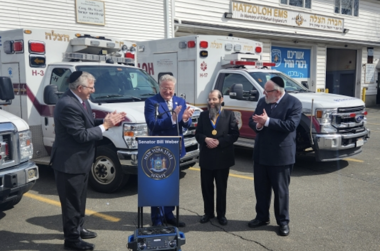 State senator Bill Weber awarding Hatzalah member Naftali Schischa with a Liberty medal. Credit: Office of Senator Bill Weber